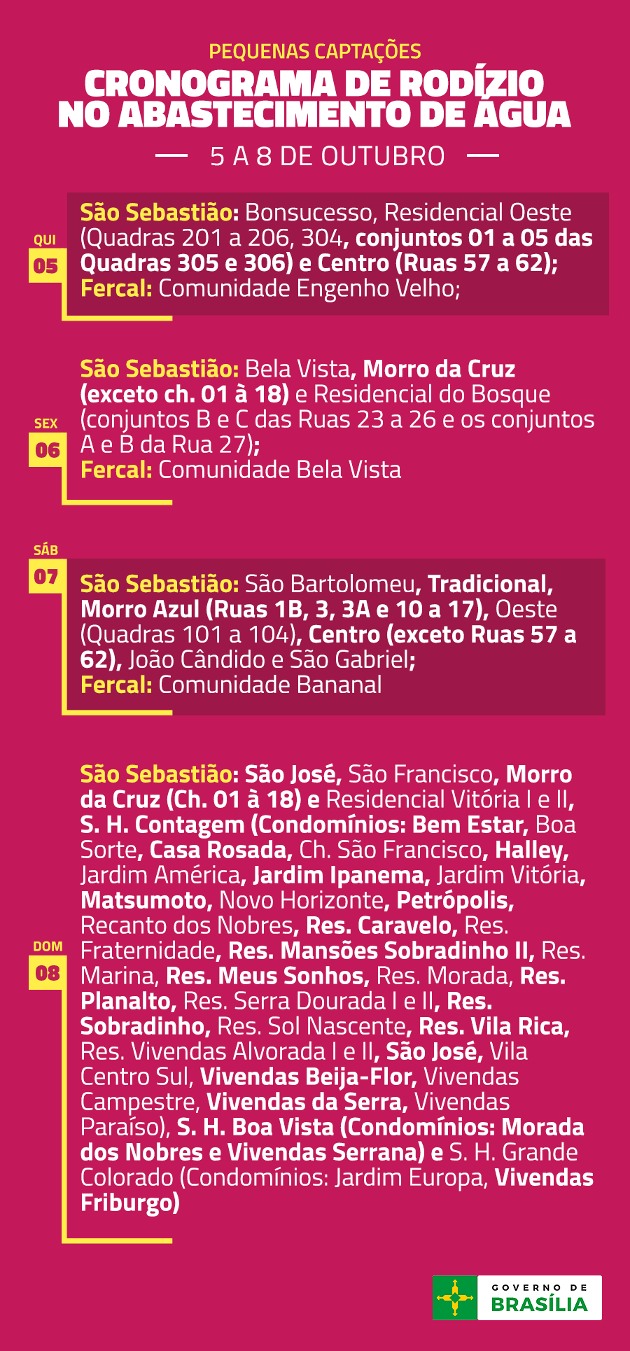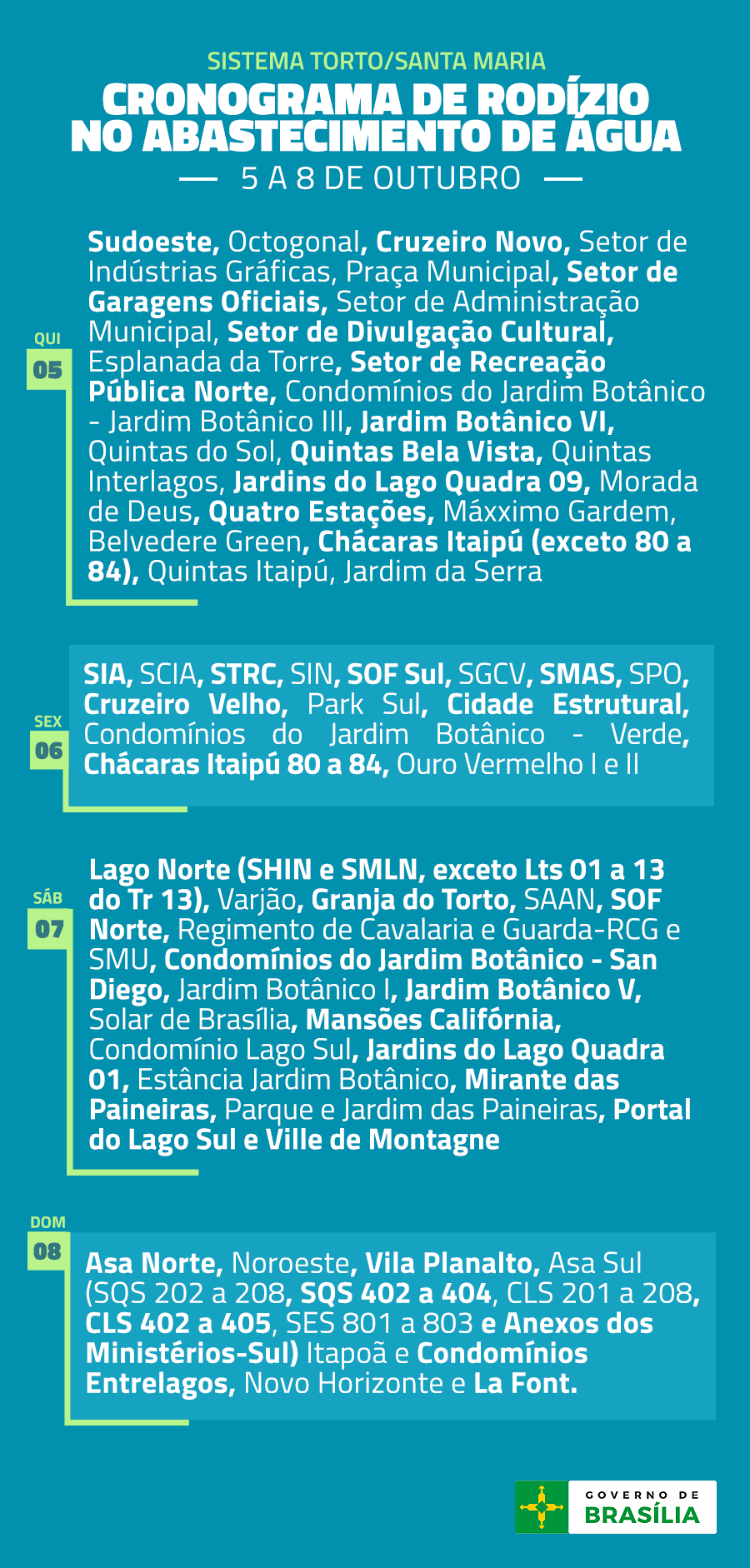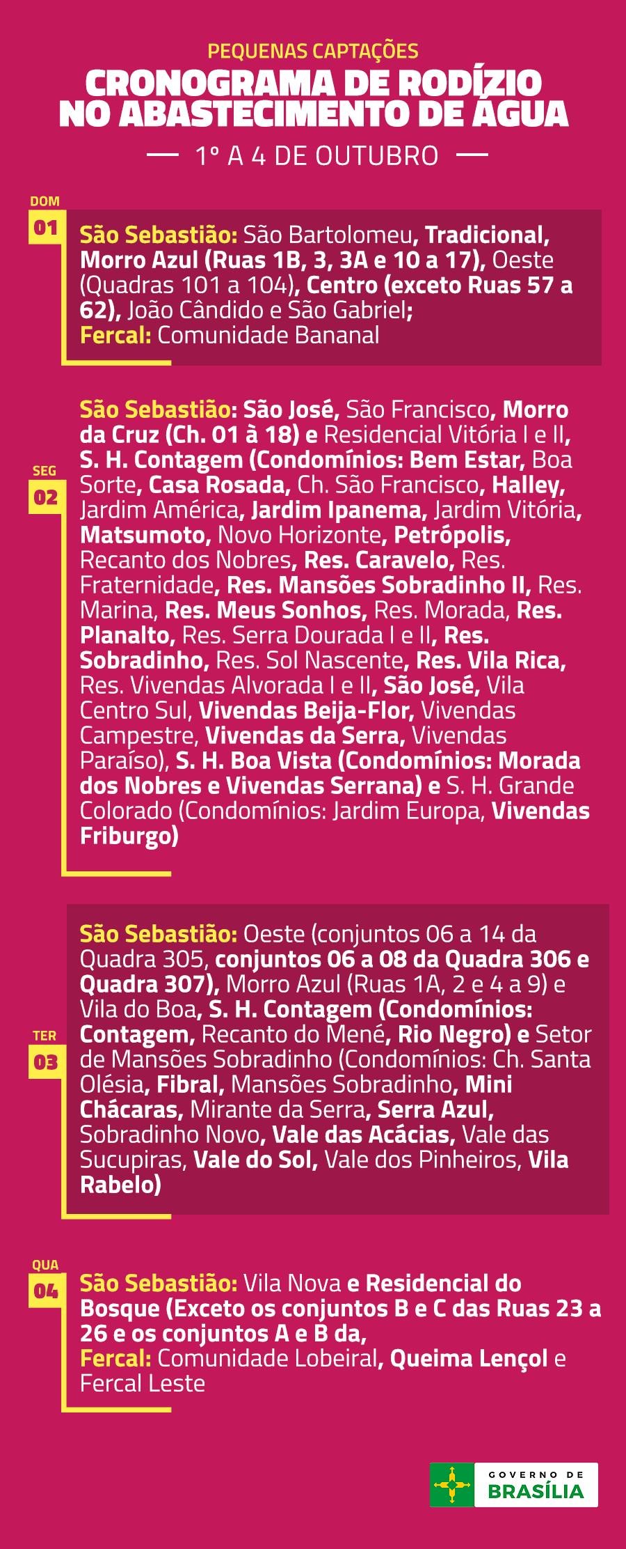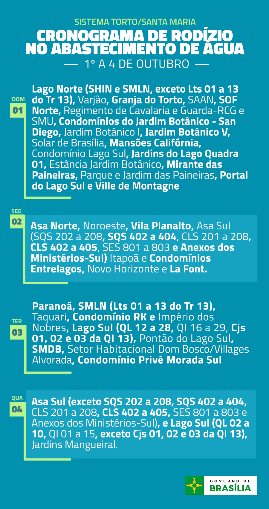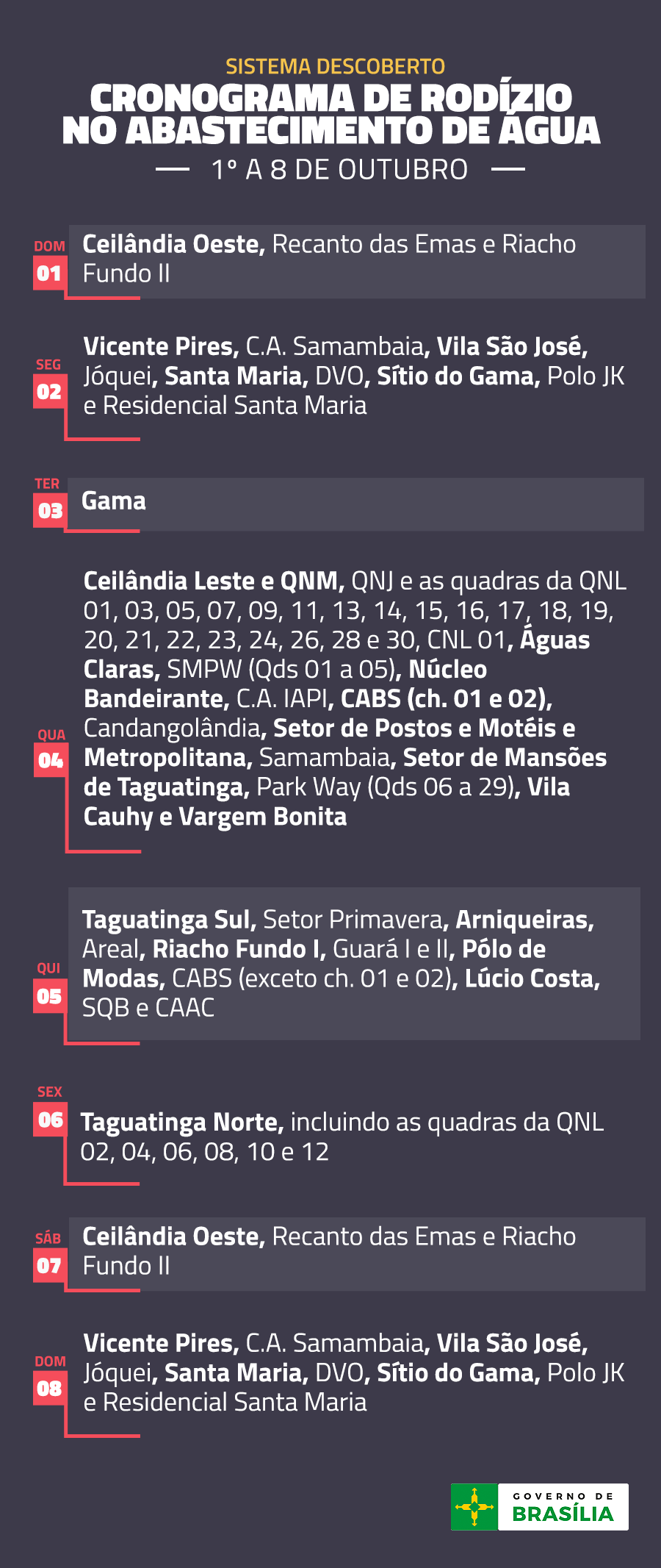 Cronograma de Rodízio – 1º a 8 de outubro
