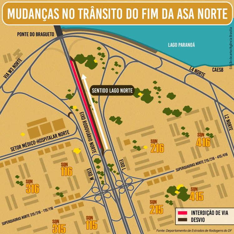 O Eixão Norte receberá um desvio a partir das 10 horas de quinta-feira (17) por causa das obras do Trevo de Triagem Norte. A alteração será na altura das quadras finais da Asa Norte, no trecho que antecede a Ponte do Bragueto.