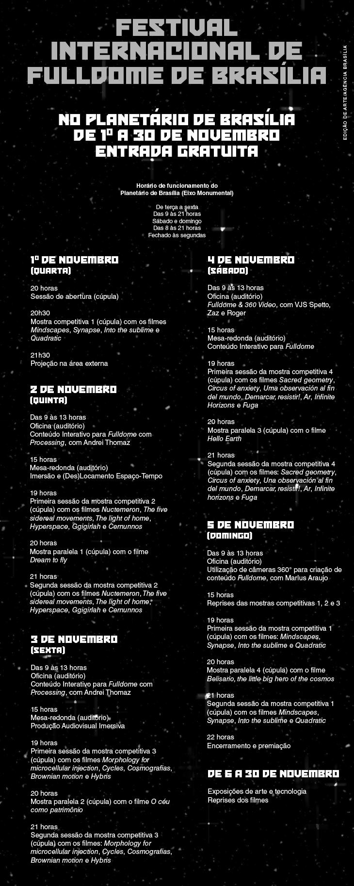 A partir de 1° de novembro, o Planetário de Brasília receberá o Immersphere — Festival Internacional de Fulldome de Brasília. O evento contará com exibições de filmes nacionais e internacionais até 30 de novembro. A entrada será gratuita.