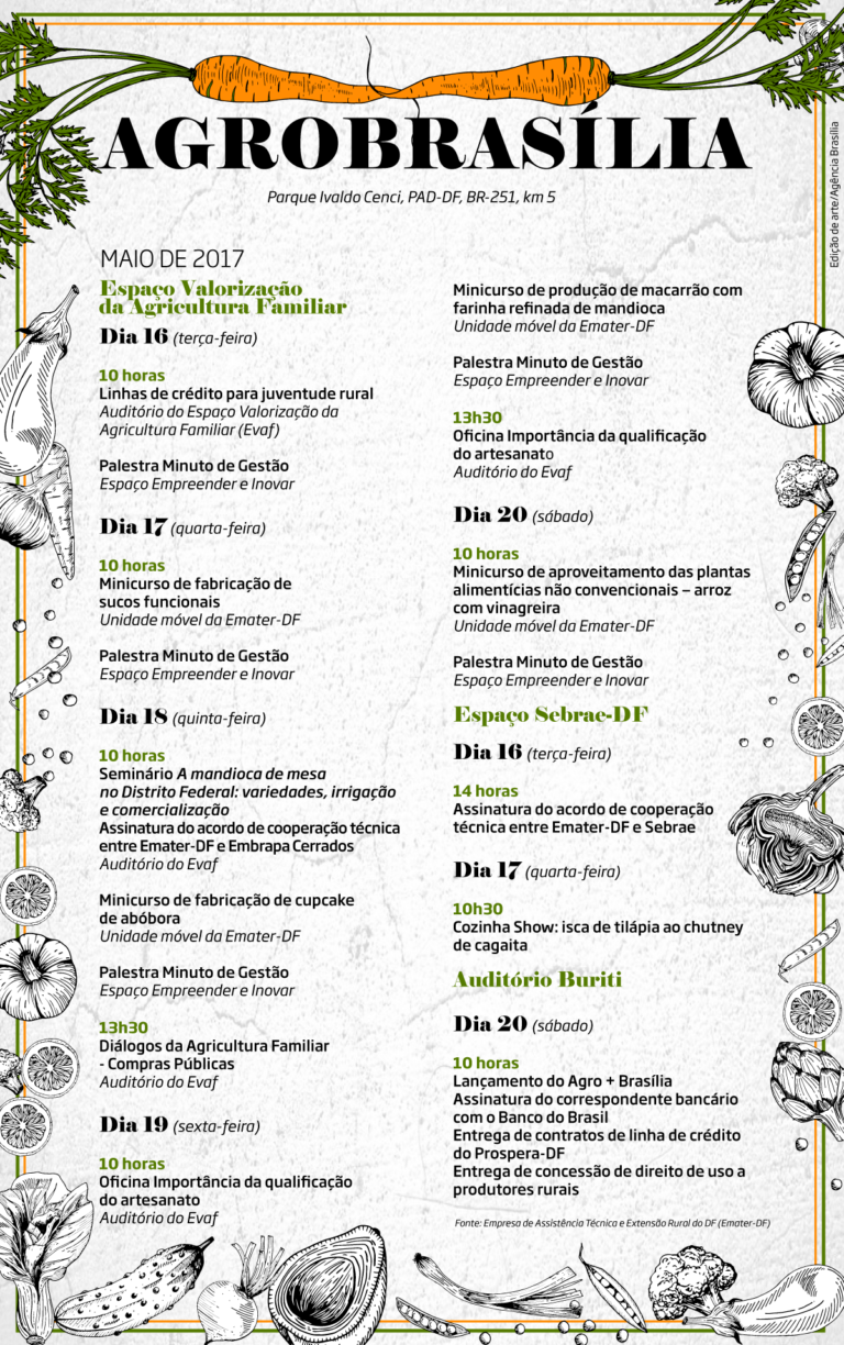 O Serviço Brasileiro de Apoio às Micro e Pequenas Empresas (Sebrae-DF), por sua vez, terá estande para informação sobre serviços e cursos. “A AgroBrasília tem programação para todos os grupos: agricultura empresarial e familiar”, detalha o presidente da Emater.