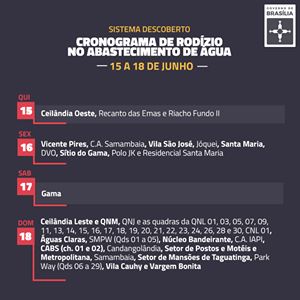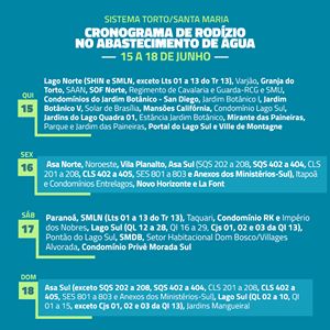 Abaixo segue a programação completa sobre o rodízio no abastecimento de água referente aos sistemas Santa Maria/Torto e Descoberto. Calendário de 11 a 15/06