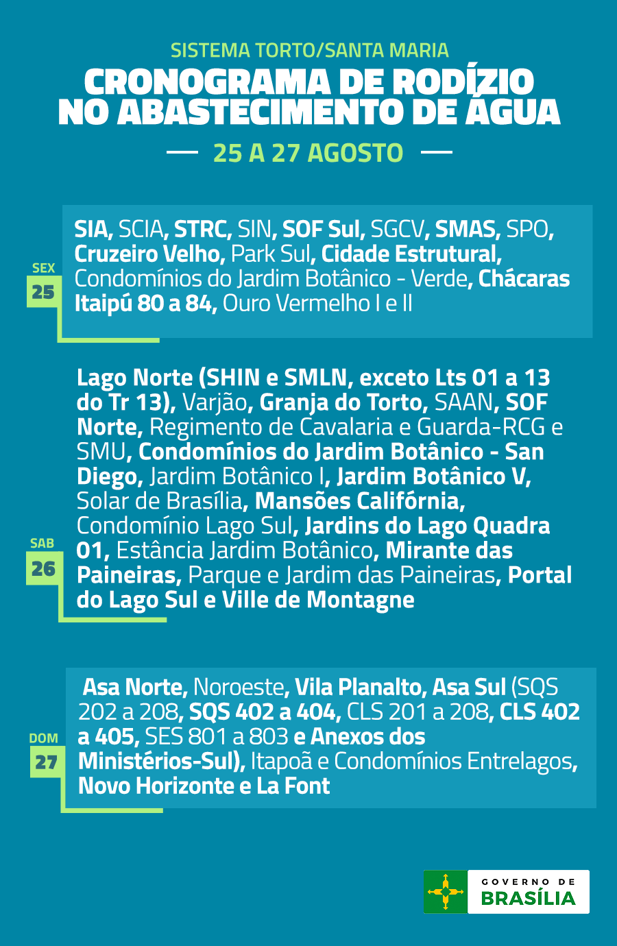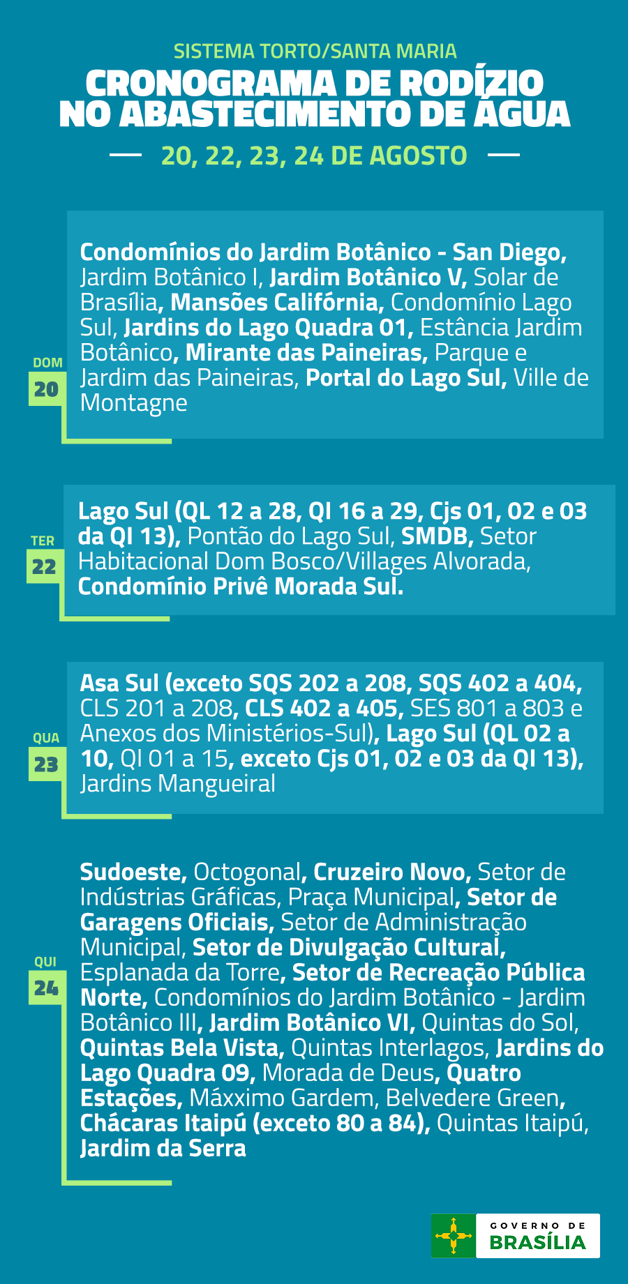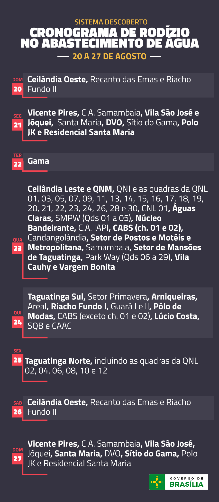 Rodízio no abastecimento de água 20 a 27 de agosto