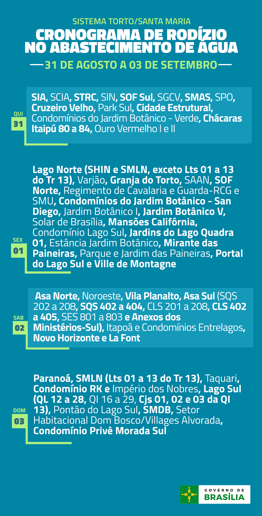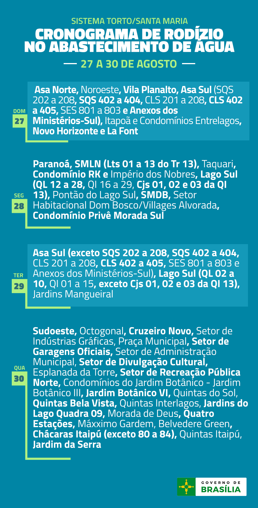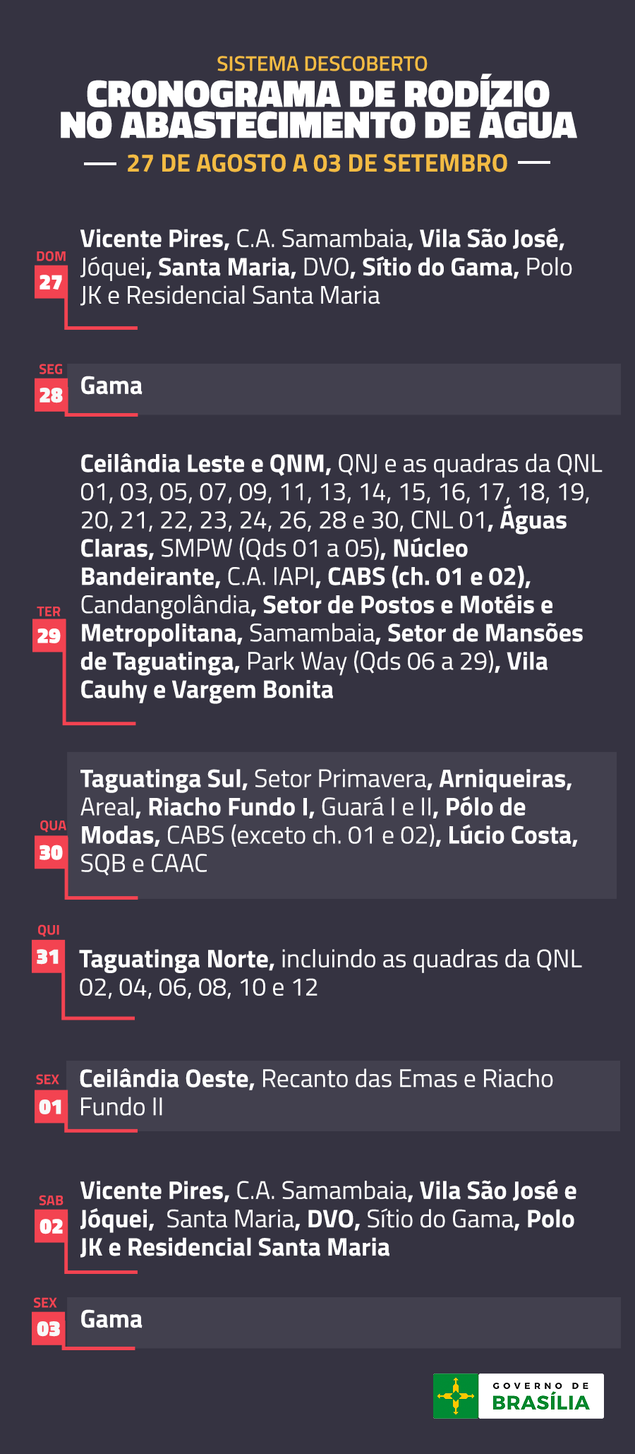 Rodízio no abastecimento de água 27 de agosto a 03 de setembro